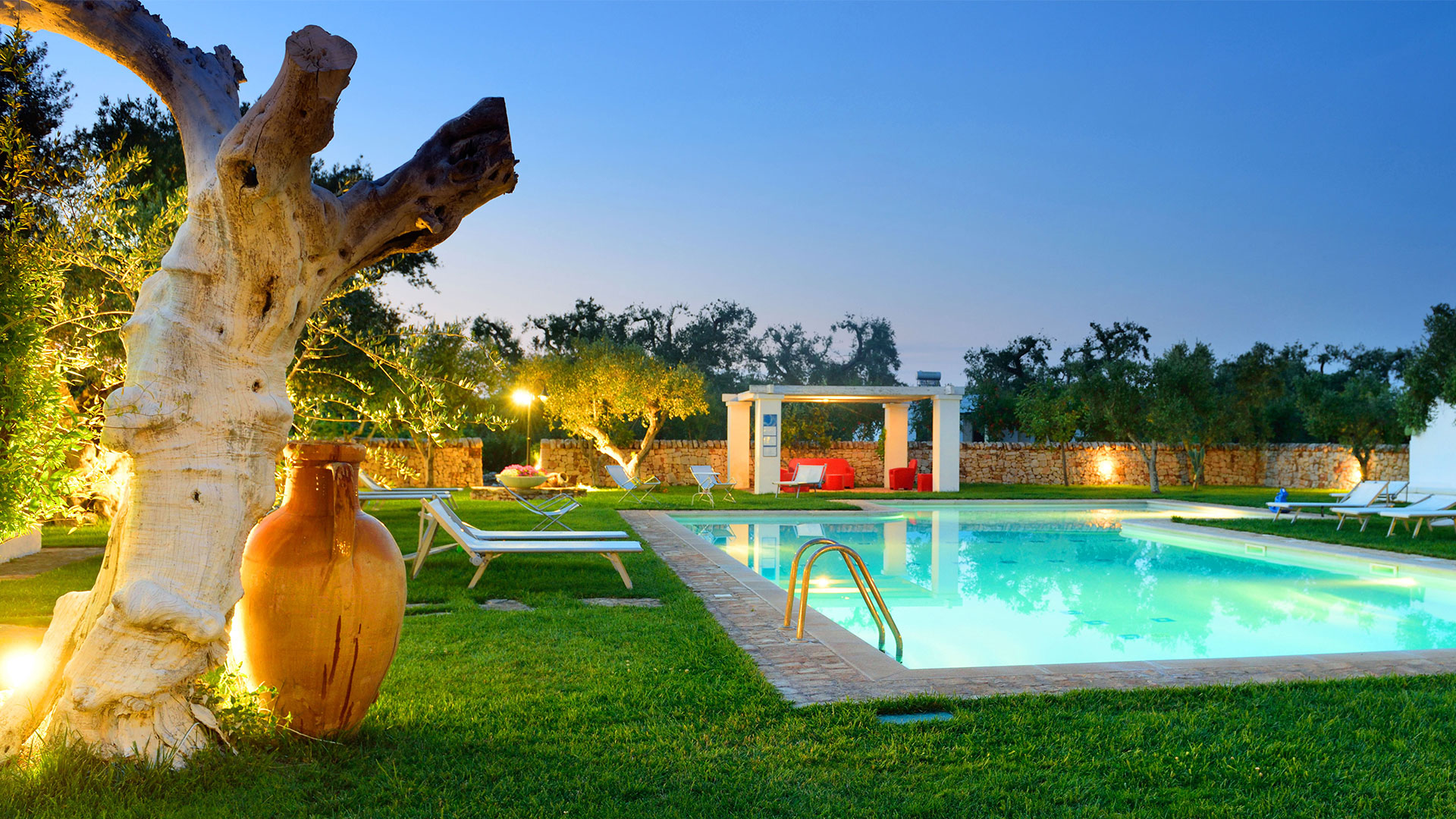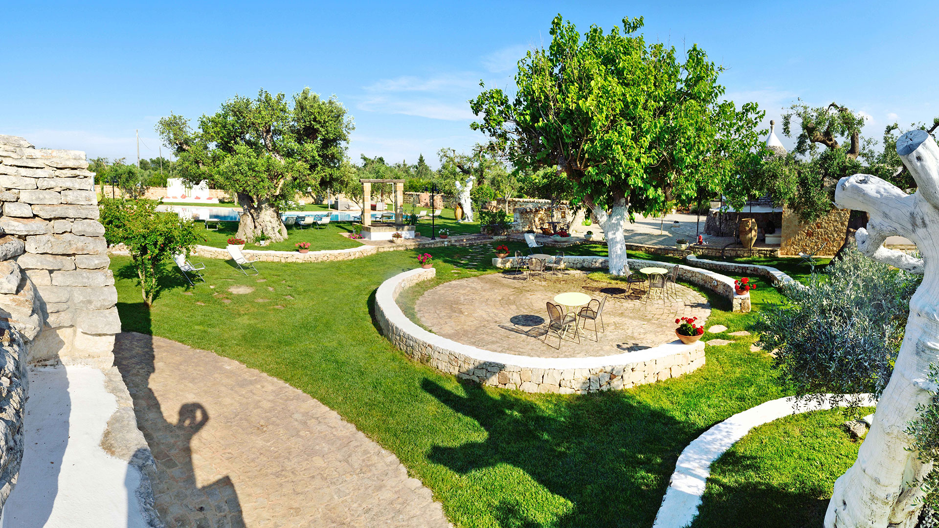 All'esterno è possibile trascorrere piacevoli momenti di relax nella corte che si estende immediatamente all'esterno del trullo, nell'aia, nell'area barbecue o a bordo piscina. La Corte dei Trulli sorge al centro di un terreno privato che si estende per oltre 24.000 metri quadrati, dominato dalla vegetazione tipica di questo angolo di Puglia. Immersi in questo quadro incantevole, i trulli sembrano quasi spuntare tra ulivi secolari, possenti piante di mandorlo e i più svariati alberi da frutto.