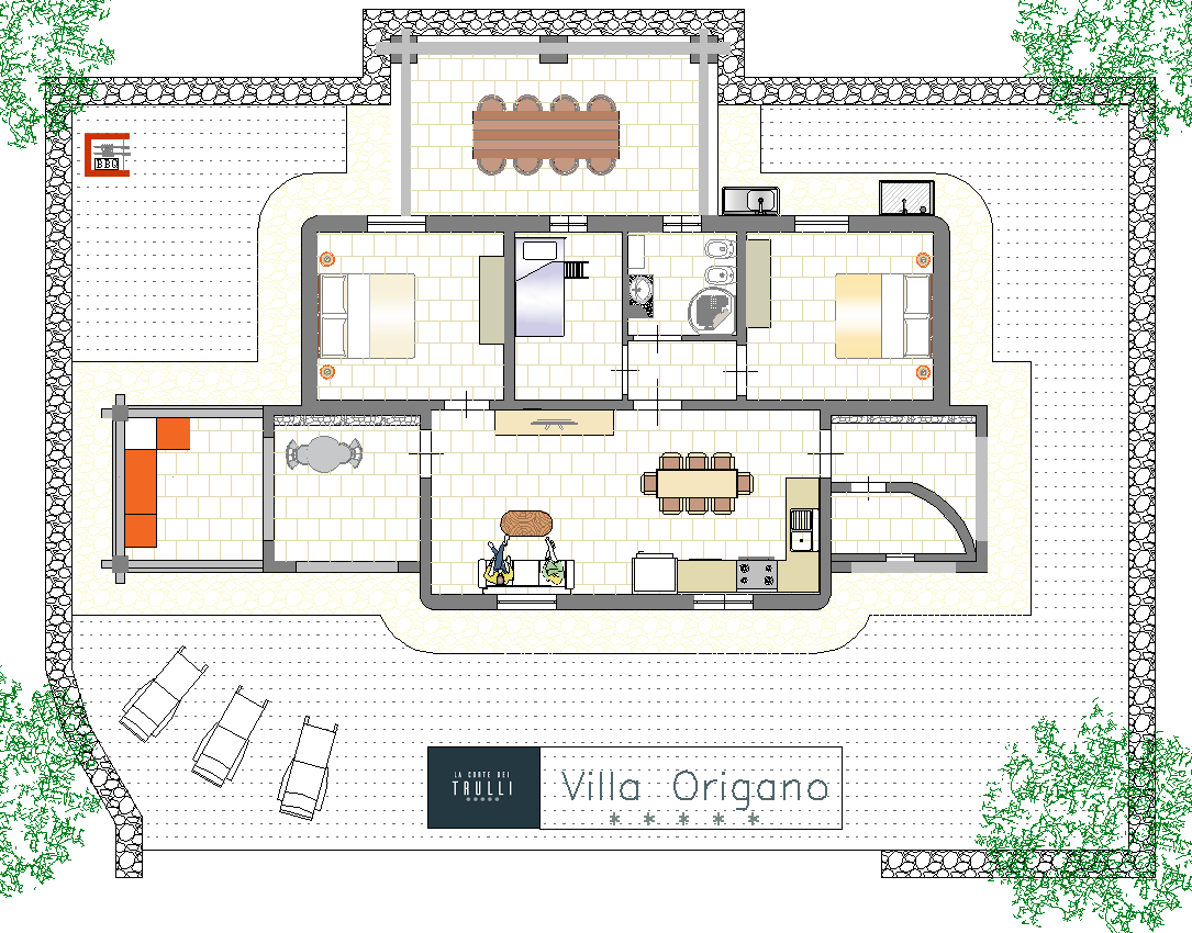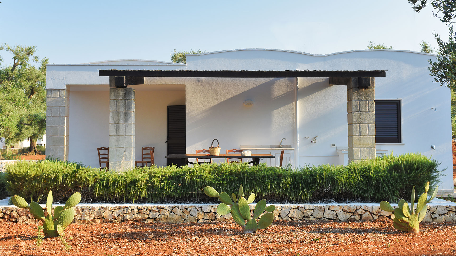 Nasce in circa tre ettari di terreno interamente recintato da muri in pietra invecchiati dal tempo. Alla villa si accede tramite un tranquillo tratturo , tipico della campagna pugliese dove dominano maestosi alberi di ulivo secolari con altrattanto belli alberi di mandorlo, fichi e fichi d'india. La villa presenta delle forme estetiche molto semplici in essa ci sono pochi ma calibrati elementi d'arredo dove si inrociano rustico e moderno. Ci sono 2 camere matrimoniali con letto in ferro battuto, comodini ed armadio in arte povera. Un camera per i più piccoli con letto a castello ed armadio. Bagno completo di servizi con doccia, anche doccia esterna con acqua calda. Ampia sala con tavolo e sedie di tipo rustico, angolo cottura a vista con lavello, cucina a 4 fuochi a gas, forno elettrico, cappa aspira odori, frigo con congelatore, lavatrice, lavastoviglie. Climatizzatore, TV a schermo piatto. Sistema di allarme, cassaforte. Piccola veranda antistante con teli ombeggianti , tavolino e sedie per la prima colazione. Sul retro ampia veranda in legno e cannette con tavolo in legno di tipo rustico e sedie, ideale per la cena. Dalla villa si percorre un piccolo sentiero / vialetto fatto di breccia bianca con la presenza di svariate piante mediterranee e alberi da frutto e si raggiunge la maestosa piscina a cloro con piastrelle in mosaico. La piscina ha tre livelli di altezza . La piscina è circondata da muri in pietra , ci sono 2 solarium allestiti con divani, sdraio e lettini, zona docce. Prato circostante con piante di ulivo e da frutto. Dalla piscina si accede attraverso un'altro viale alla zona ristoro all'aperto, detta zona è costituita da ampio gazebo in ferro con cannette ombreggianti, forno a legna con bbq. Questa zona è allestita con tavoli e panche di tipo rustico. 2 lavelli e ampio piano d'appoggio in marmo . Fornitura legna sempre disponibile.L a villa è singola ed indipendente con cancello d'entrata e posto auto, Il giardino e la zona piscina sono aree comuni ad altri alloggi simili presenti nello stesso terreno. Zona ideale per grande famiglia o comitiva.